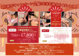 1月のキャンペーンは、フェイシャル&ボディそれぞれ1メニューずつの2メニューです♪